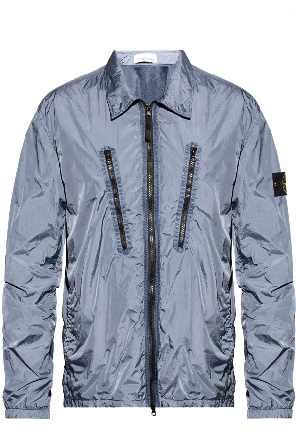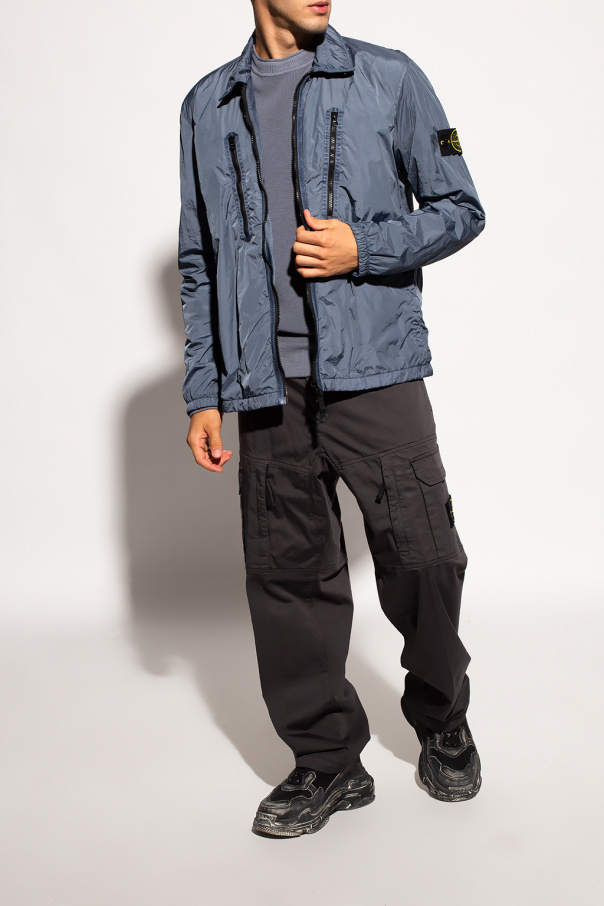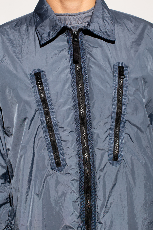 Navy blue jacket from Stone Island. Emblazoned with a detachable black, yellow and green logo patch, this style features a zip fastening, two zipped pockets, two snap-fastened pockets and long sleeves with elasticated cuffs.