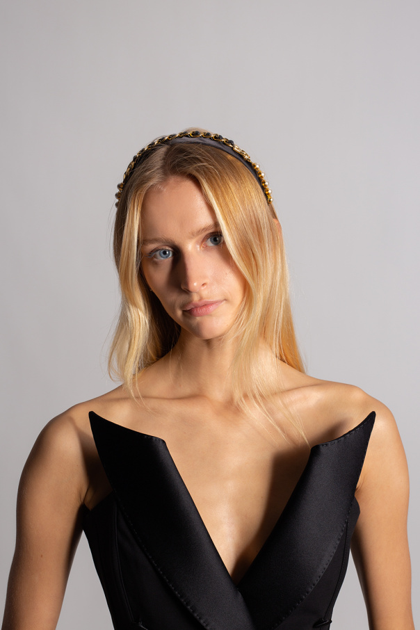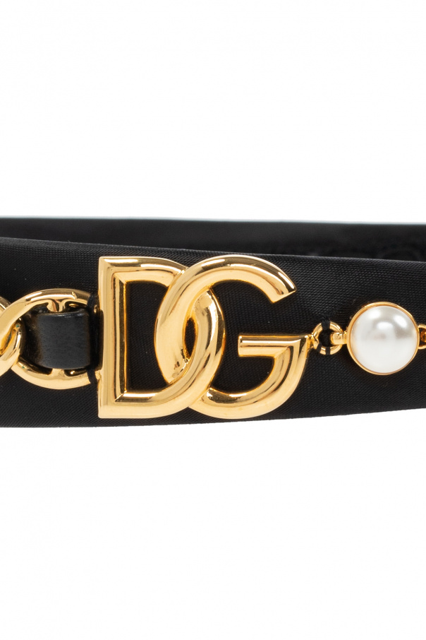 Black headband from Dolce & Gabbana. This item is embellished with a brass logo plaque, glass pearls and a leather strap intertwined with a chain.