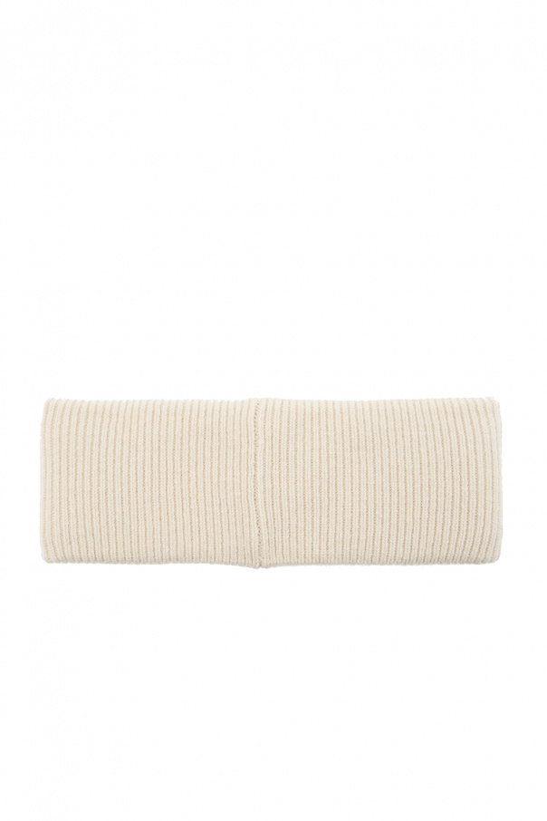 Cream headband from Acne Studios. Crafted from a ribbed wool knit, this item showcases a tonal logo patch for brand recognition.