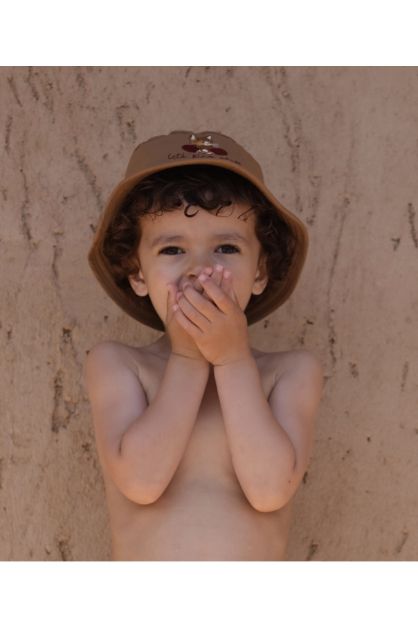Brown swim hat from Konges Slojd. Crafted from recycled materials, this item showcases colourful animal embroidery on the front. The stretchy fabric protects against the sun’s UV rays with the highest ultraviolet protection factor, UPF 50+.