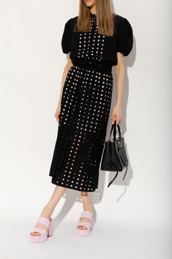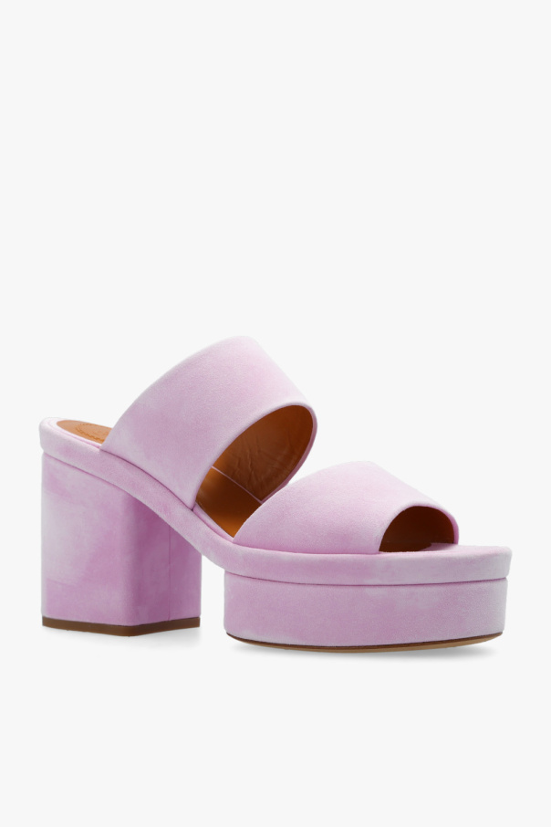 Pink ‘Odina’ platform slides from Chloé. Made of suede, this pair features a round toe, chunky heel and beige leather sole.