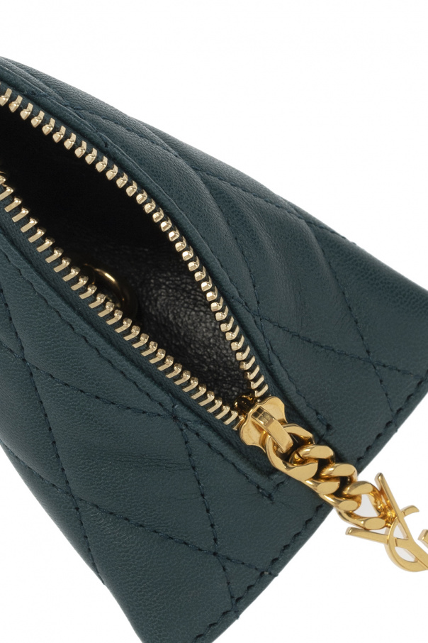 Dark greenish-blue quilted key holder from Saint Laurent. Crafted from lamb leather with a triangular shape, this item features a gold-tone zip fastening with a logo charm, and an included chain strap with a lobster clasp fastening.