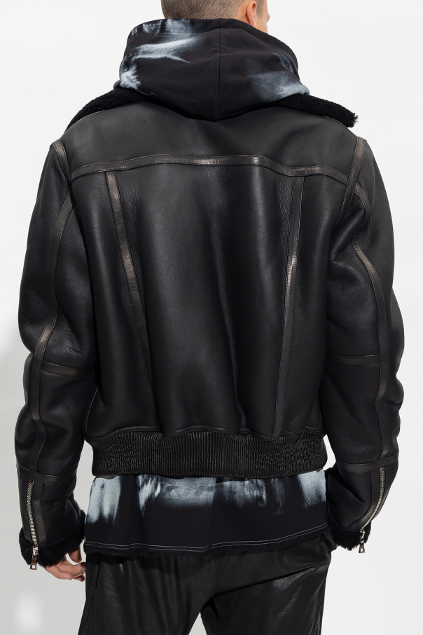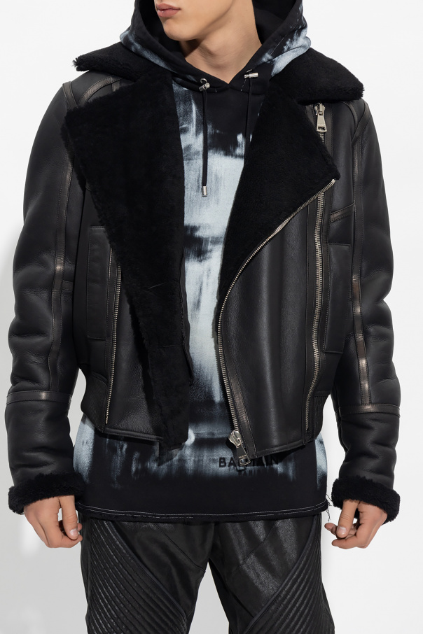 Black jacket from Balmain. Crafted from lamb leather, this style fastens with two zippers and features lamb fur trims on the collar and cuffs, two slip pockets, long sleeves with zip cuffs and rib detailing on the bottom hem.