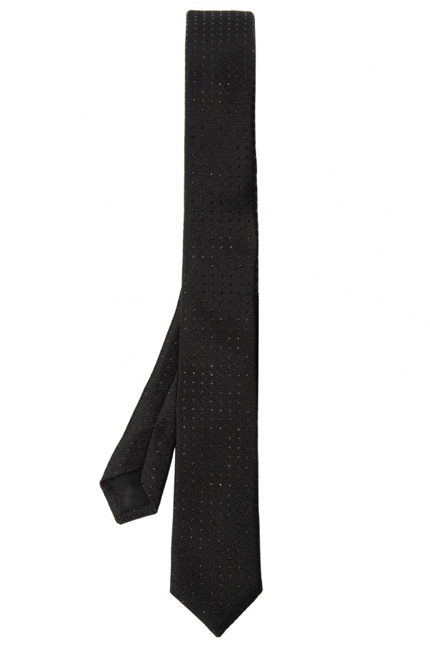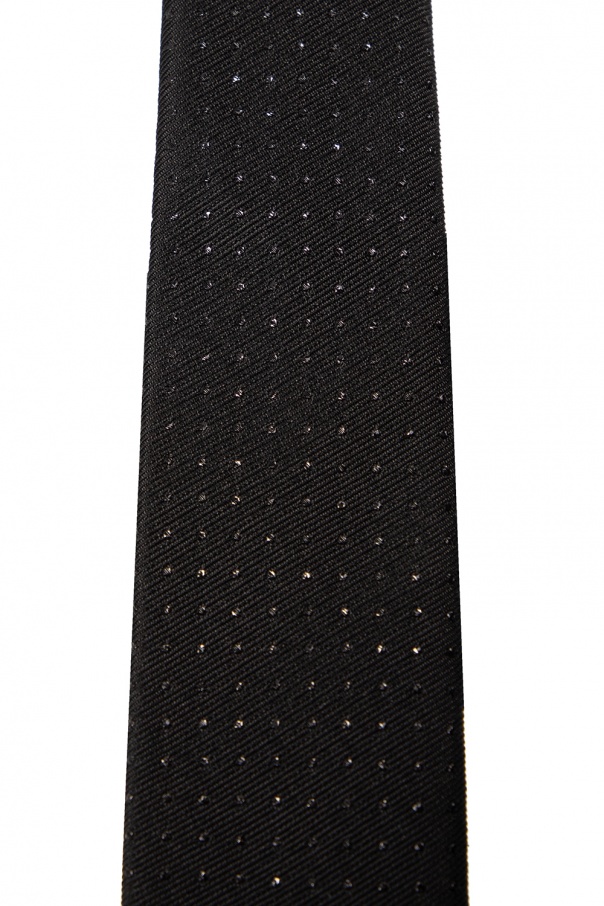 Black tie from Saint Laurent. Woven from silk, this accessory was inlaid with silver-tone lurex yarn for a shimmering effect.
