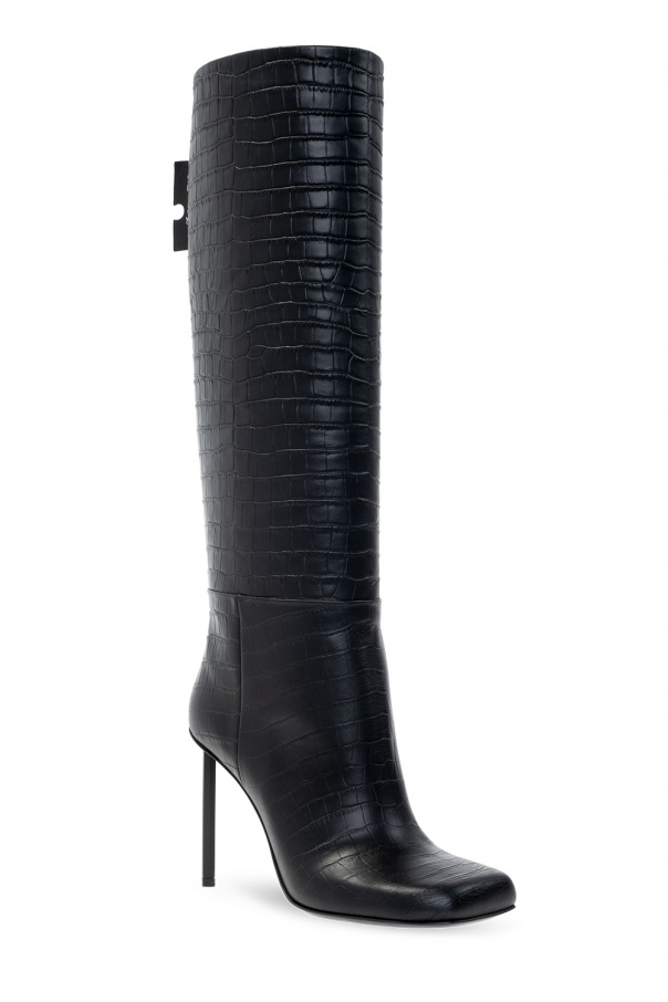 Black ‘Allen Coco’ heeled boots from Off-White. Crafted from leather with a crocodile skin effect, this model features a square toe, a back logo patch and a black leather sole.