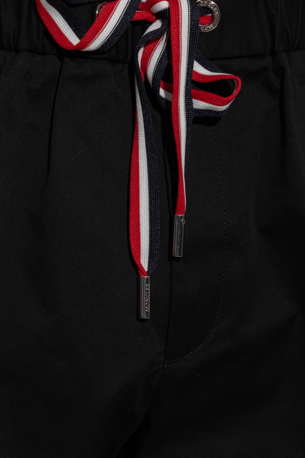 Black trousers from Moncler. Made of cotton. Fastened with navy, white and red drawstrings, this pair features an elastic waistband, zip fastening, felt logo patch at the back, two slip pockets, one zipped back pocket and ribbed cuffs with snap and zip fastenings.