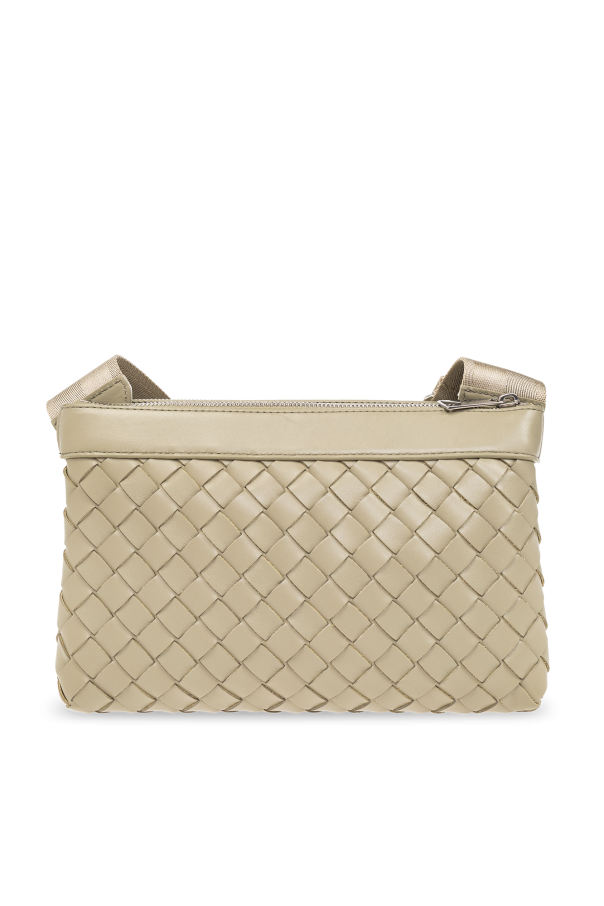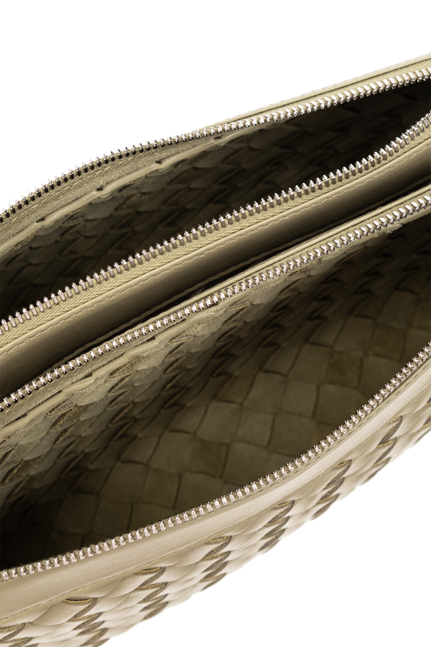 Greenish grey ‘Classic Duo’ shoulder bag from Bottega Veneta. Made of calf leather with the brand\'s signature Intrecciato weave, this design fastens with zips and consists of two parts, connected by snaps. It is complete with an adjustable shoulder strap, silver-tone metal hardware and two internal compartments.