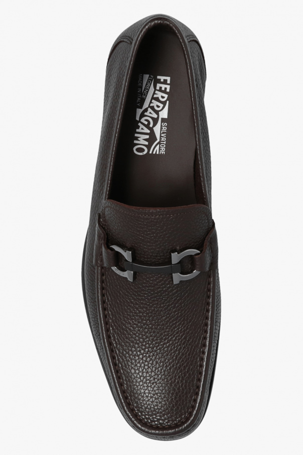 Dark brown ‘Grandioso’ loafers from FERRAGAMO. Made of calf leather, this pair is complete with a silver-tone and dark brown metal Gancini appliqué and black rubber sole.