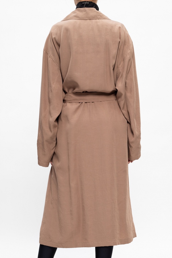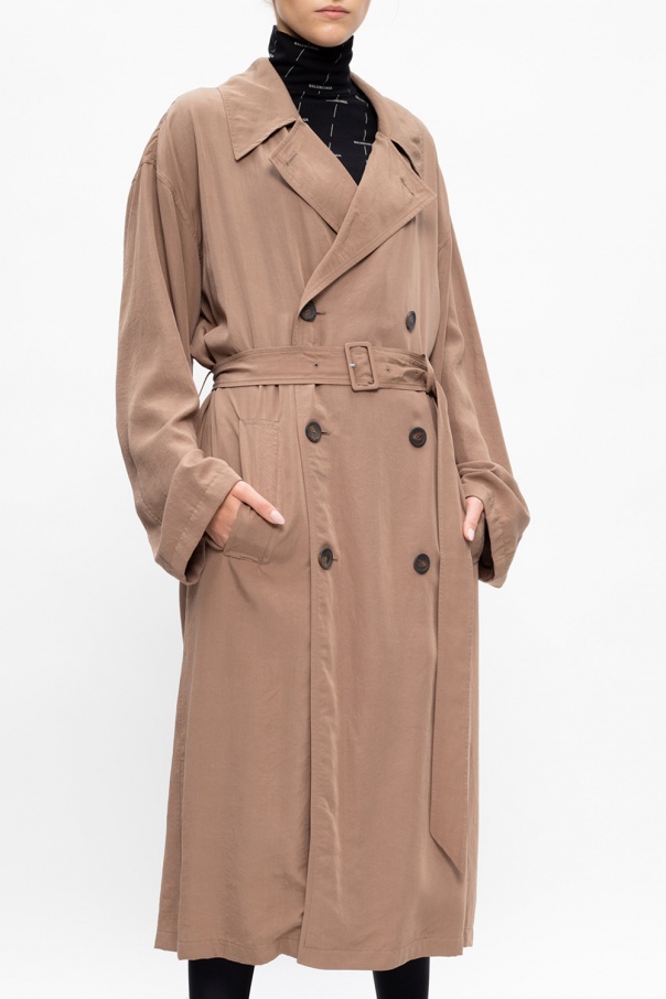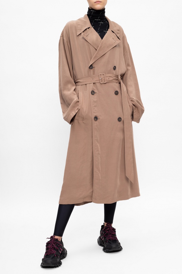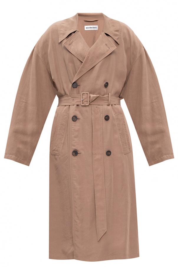 Beige trench from Balenciaga. Boasting a double-breasted silhouette, this piece of outerwear fastens via buttons and employs long sleeves, two welt pockets on the front and cinching buckle belt at the waist.