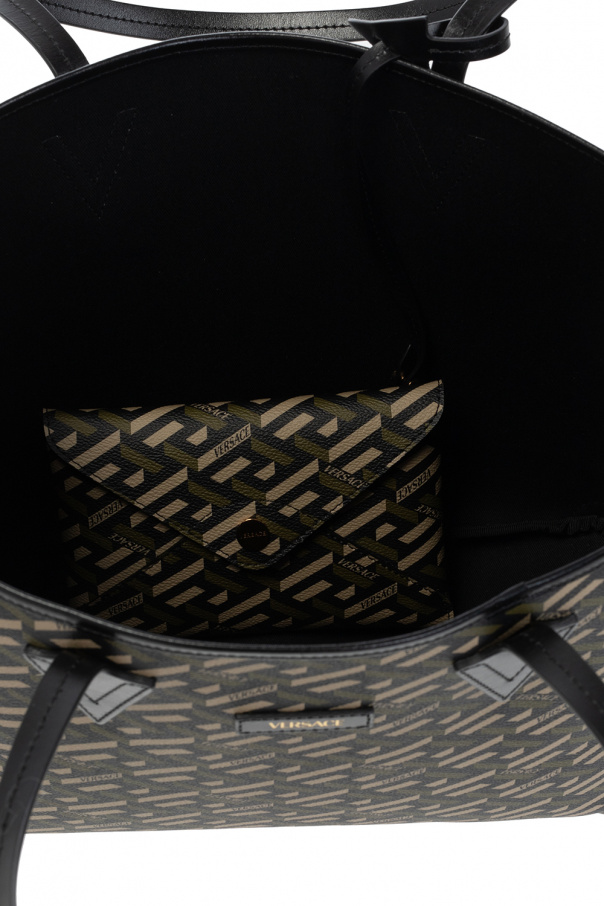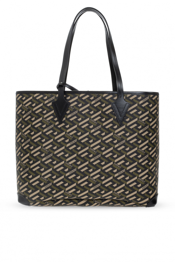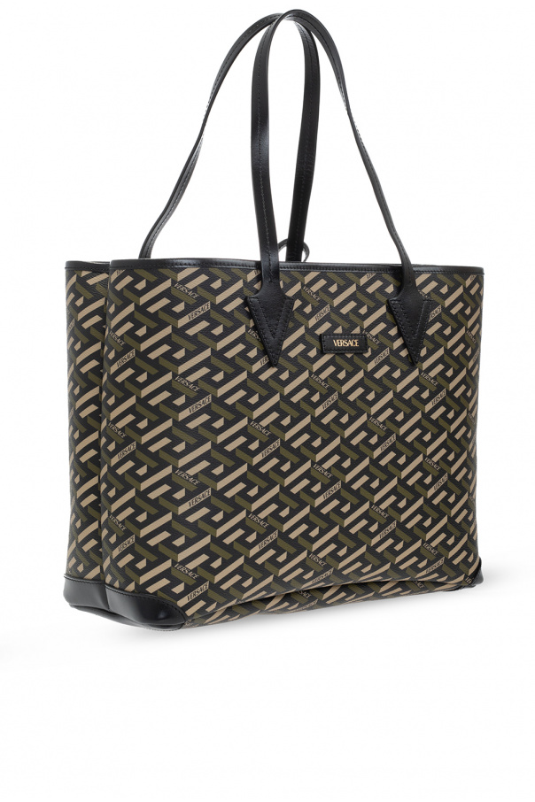 Black, green and beige shopper bag from Versace. Crafted from calf leather, this item showcases a monogram pattern, two half-round handles, gold-tone metal hardware and one internal compartment. It comes with a sunglasses case as well.