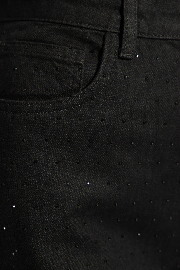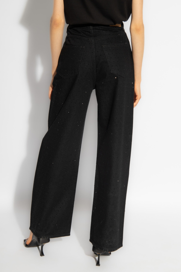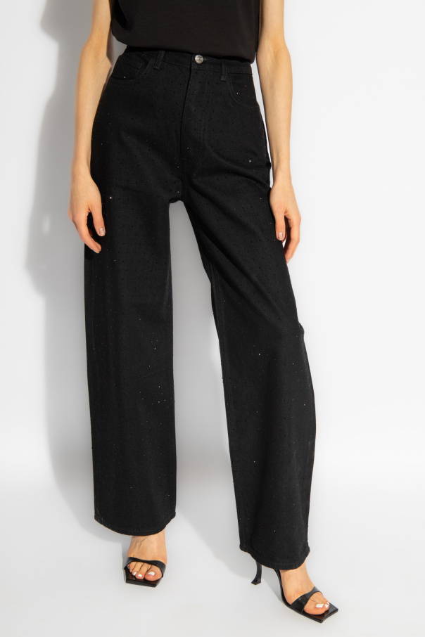 Black ‘Shellly’ jeans from Samsoe Samsoe. Made of organic cotton and spruced up with sparkling rhinestones, this pair falls with wide, straight legs and features button fastenings, classic five-slip pockets and a logo patch on the back.