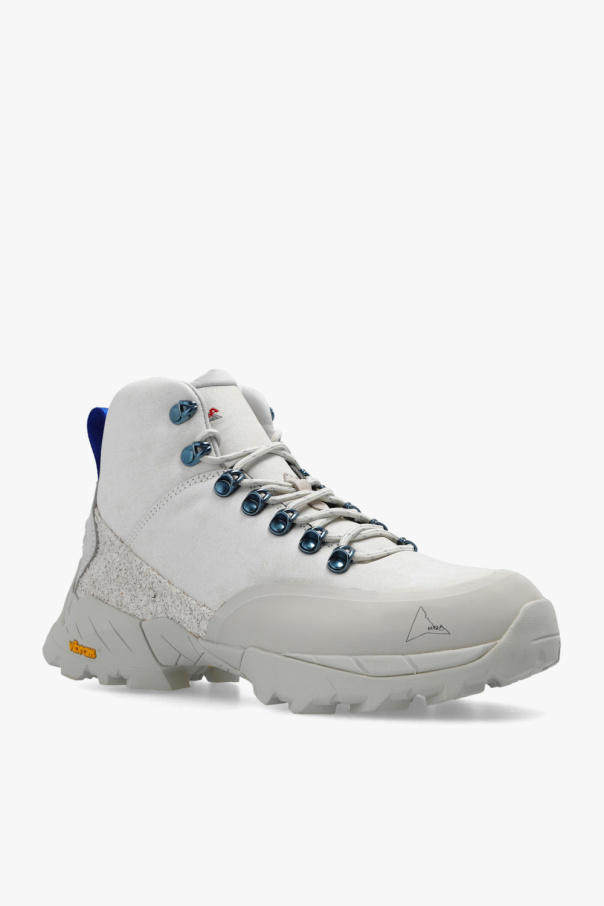 Cream ‘Andreas’ hiking boots from ROA. Crafted from suede and fabric, this lace-up model features the brand\'s logo, rubber trims and a light grey Vibram Megagrip toothed tread pattern sole designed for optimal traction and to ensure high resistance to use on roughest surfaces. Swappable cream laces included.