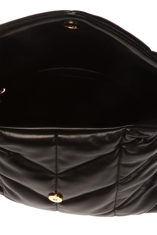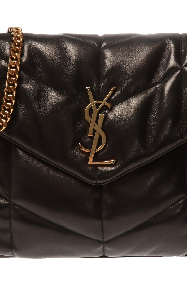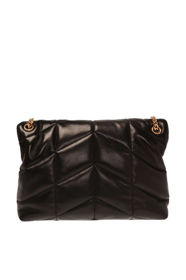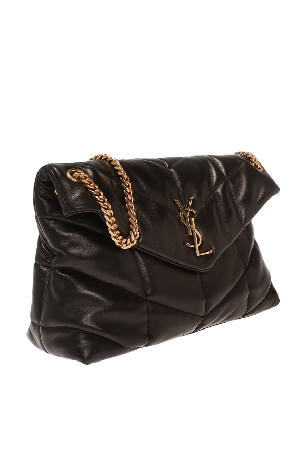 Black ‘Loulou Puffer’ quilted shoulder bag from Saint Laurent. Size medium. Crafted from lamb leather, this design fastens via snap-button and employs antique gold-tone metal hardware, including YSL initials, a double shoulder strap reinforced with chain and interior with one compartment and one zip pocket.