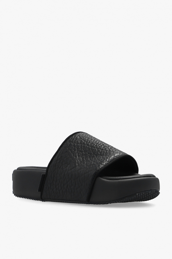 Black slides from Y-3 Yohji Yamamoto. Crafted from leather, this model sits on a black rubber sole and showcases an embossed logo.