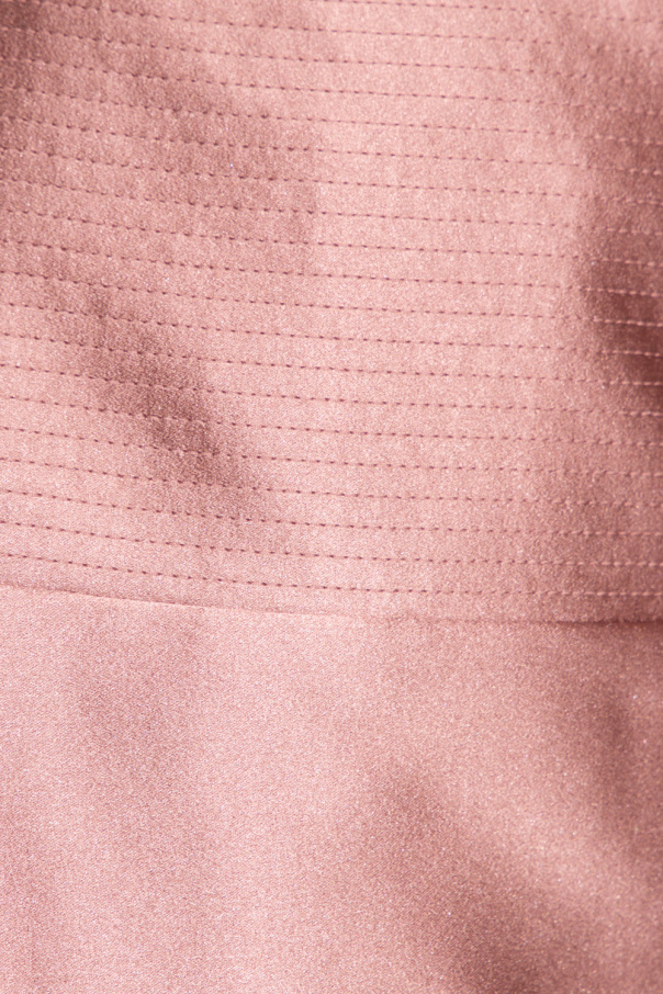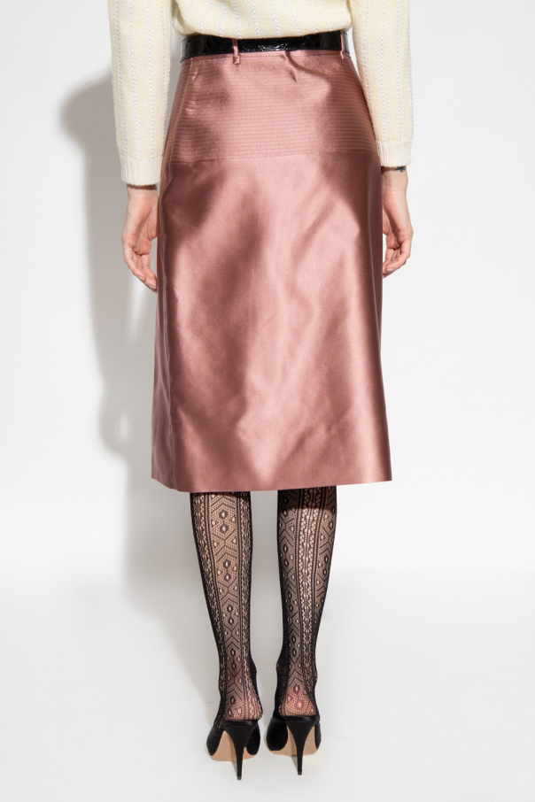 Blush pink skirt from Gucci. Cut from silk satin, this design is complete with a concealed side zip, adjustable belt with a gold-tone metal buckle, decorative stitching and slit on the front.