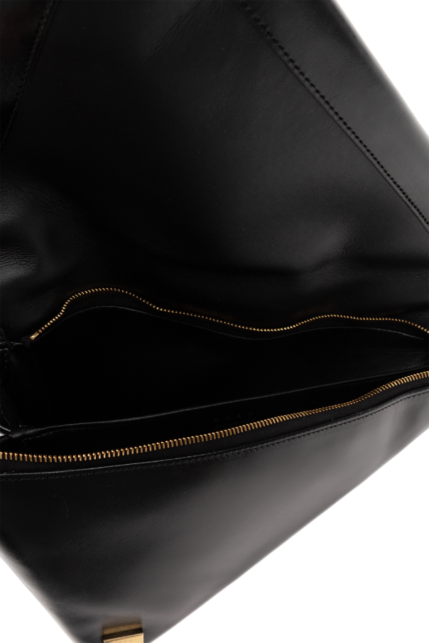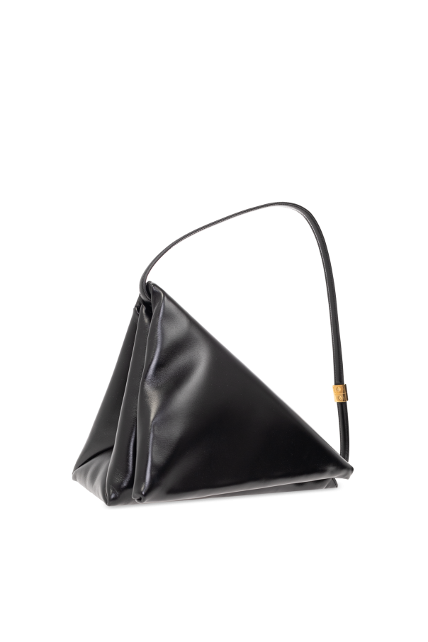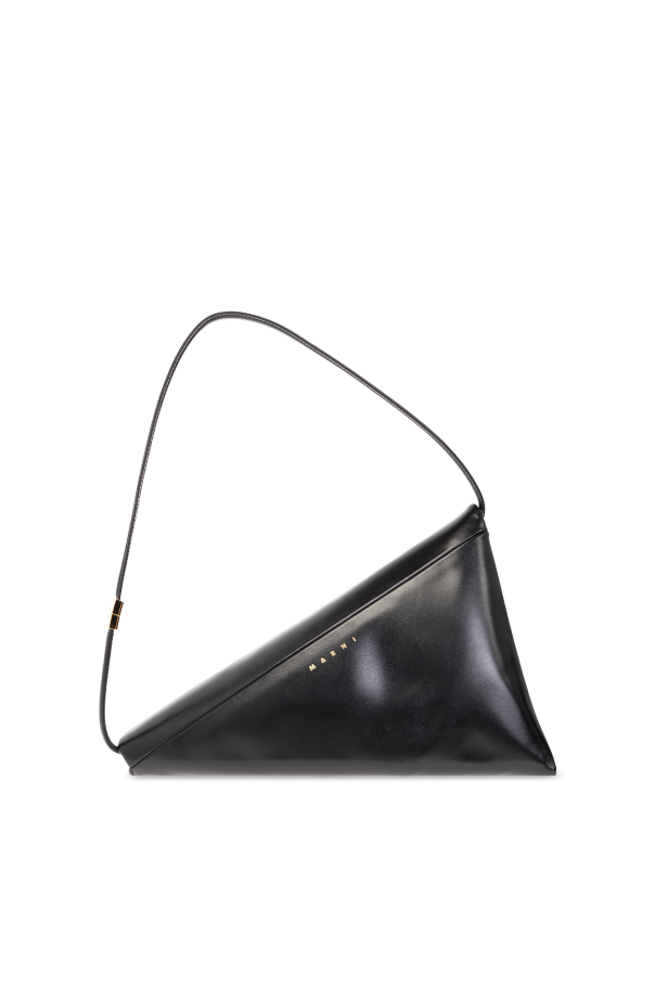 Black ‘Prisma’ shoulder bag from Marni. Made of calf leather, this triangle-shaped design features hook and zip fastening, logo print, adjustable shoulder strap, two internal compartments and gold-tone metal hardware.