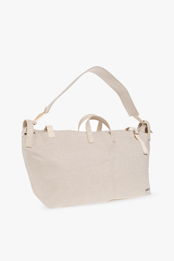 Cream ‘Le Sac A Linge’ duffel bag from Jacquemus. Crafted from a linen and cotton blend, this design secures with a zip and features a logo appliqué, two half-round handles, zipped back pocket, shoulder strap, silver-tone metal hardware and one internal compartment with one slip pocket and one snap-fastened pocket.