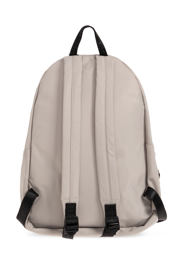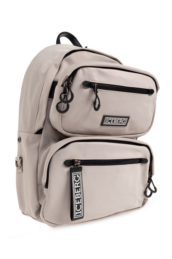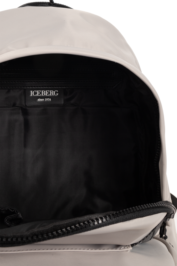 Grey and black backpack from Iceberg. Fastened with a zip, this design features a white and black logo patch, two zipped front pockets, a half-round handle, adjustable shoulder straps, black metal hardware and one internal compartment with one slip pocket and one zip pocket.
