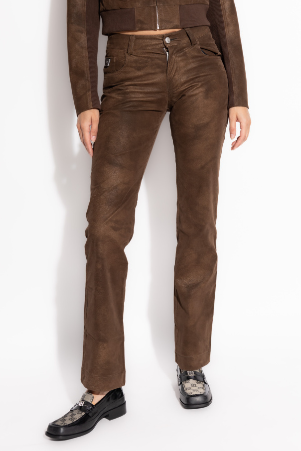Introducing the Brown Vegan Leather Trousers from the exclusive collection by MISBHV. These trousers, crafted with meticulous attention to detail, exude an air of refined sophistication. The trousers feature a rich brown hue, meticulously constructed from high-quality vegan leather. The straight cut, with slightly tapered legs that gently flare at the hem, provides a flattering silhouette. A textured surface adds an element of uniqueness, enhancing the overall appeal. Key details include a front closure with a metal button and zipper, ensuring convenience and style. The trousers are equipped with functional pockets both at the front and back, adorned with a designer logo on one of the front pockets, showcasing the brand\'s signature touch. Designed with a high waist, these trousers accentuate the figure, making them an ideal choice for various occasions. Pair them with the matching vegan leather jacket from the same collection for a cohesive and striking ensemble. Why Choose This Product? Elegant brown vegan leather construction Flattering straight cut with a gentle flare Functional pockets with designer logo detailing High waist design for an enhanced silhouette Perfect for versatile styling