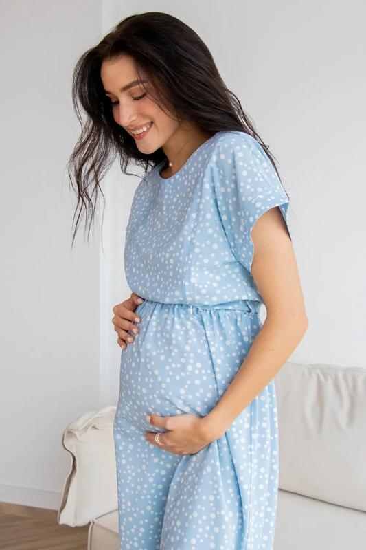 Сукня для вагітних і годуючих мам з секретом для годування, розміри: 42; кольори: блакитний, м'яка ятний, білий; склад тканини: віскоза 75%, поліестер 20%, еластан 5%. БЕЗКОШТОВНА ДОСТАВКА при замовленні від 1500 грн. Сукня-міді для вагітних та годуючих мам лаконічного крою - ідеальний варіант для легкого літнього образу. Модель прикрашена контрастним принтом у горошок, а довгий пояс-стрічка підкреслює талію на будь-якому етапі вагітності. На грудях ховаються потаємні блискавки, що робить цю сукню зручною для годування та дозволяє носити її після народження малюка. Розкльошена спідниця з воланом та короткі рукави завершують образ. Супер вільна посадка створює ідеальну легкість у русі. 5337760-Р