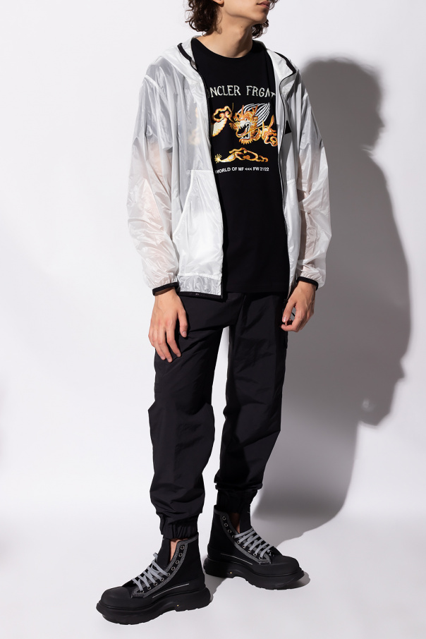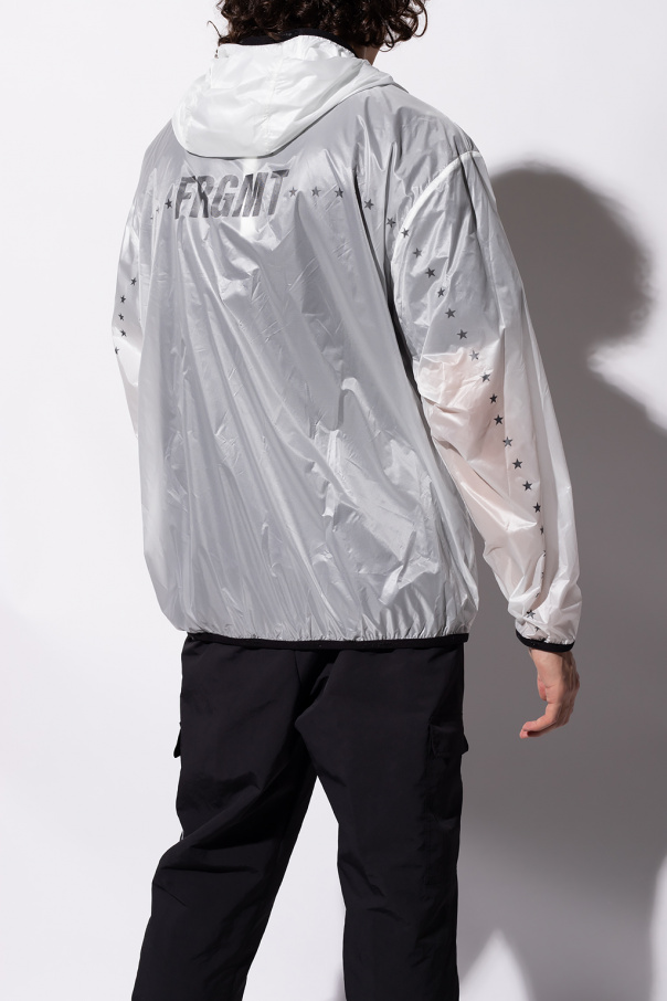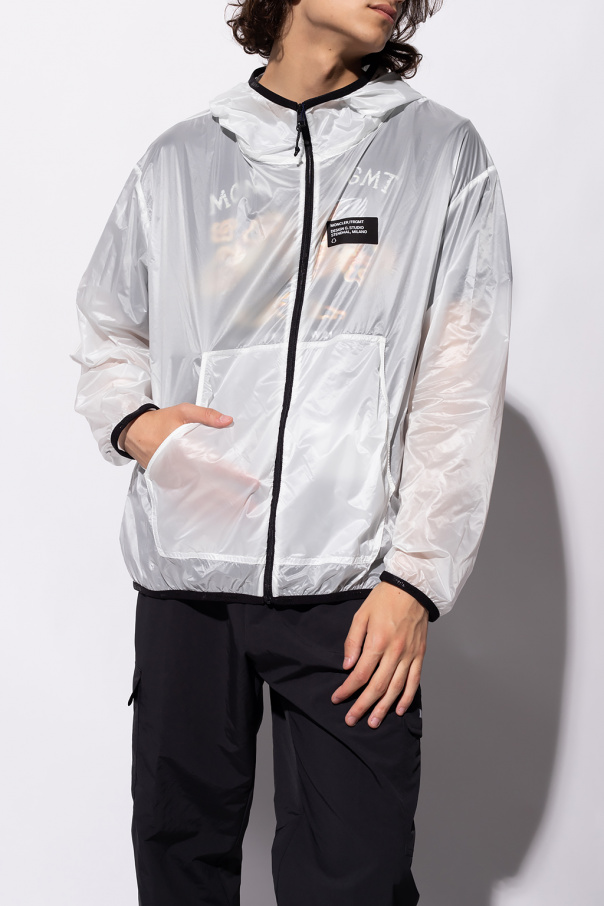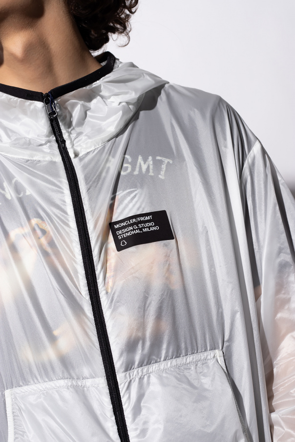 White and black ‘Mahpee’ transparent jacket with a hood from Moncler, the ‘Hiroshi Fujiwara 7’ collection. Printed with the brand\'s logo in black, this style features a zip fastening, long sleeves and two frontal pockets.