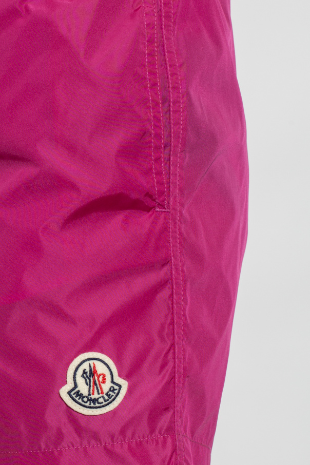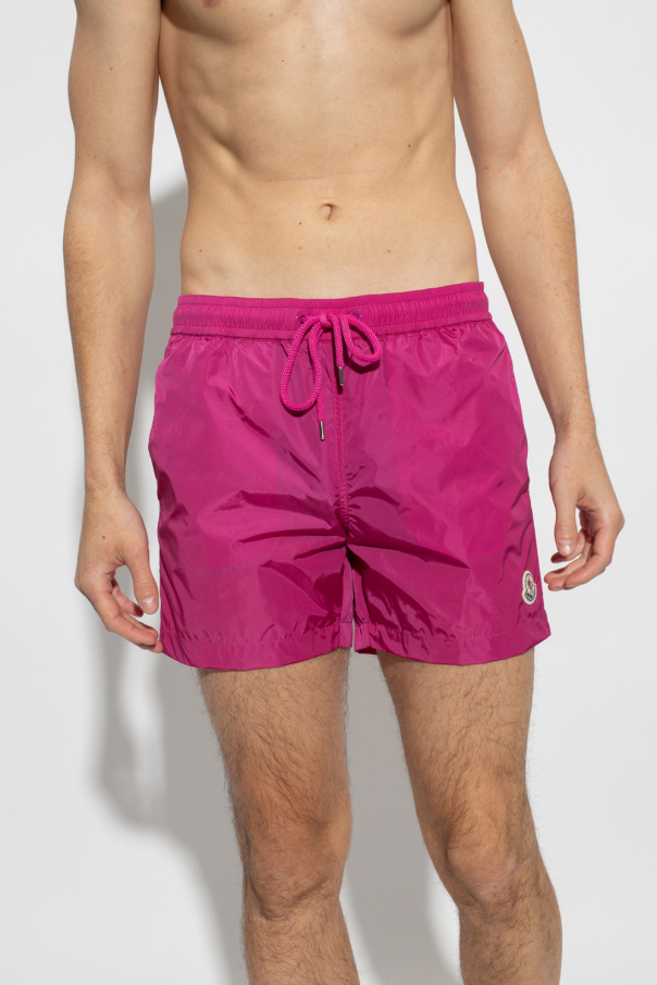 Dark pink swim shorts from Moncler. Fastened with drawstrings, this pair features a logo patch, two slip pockets and one zipped back pocket.