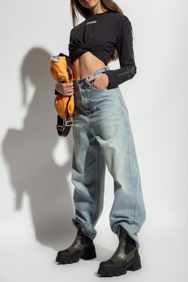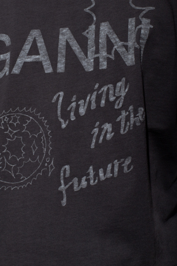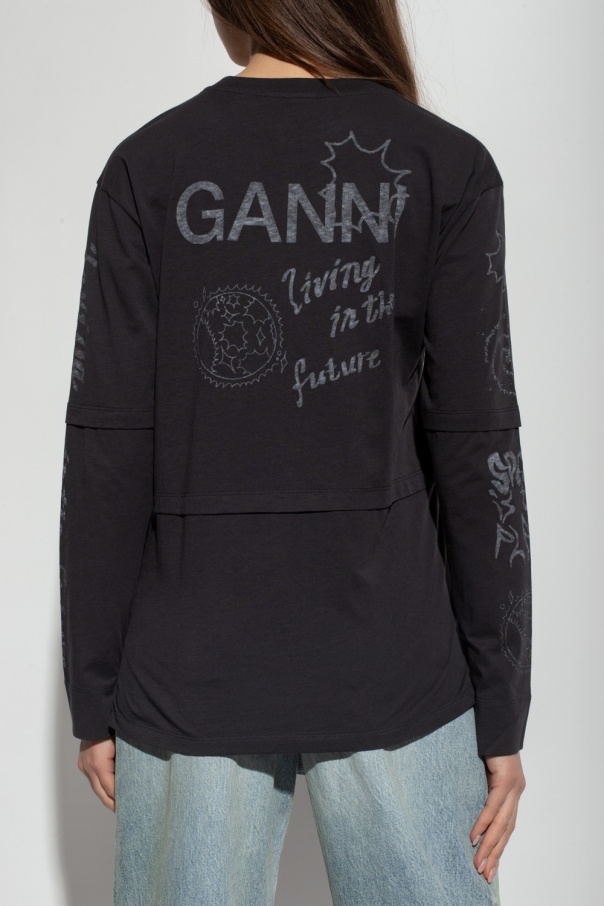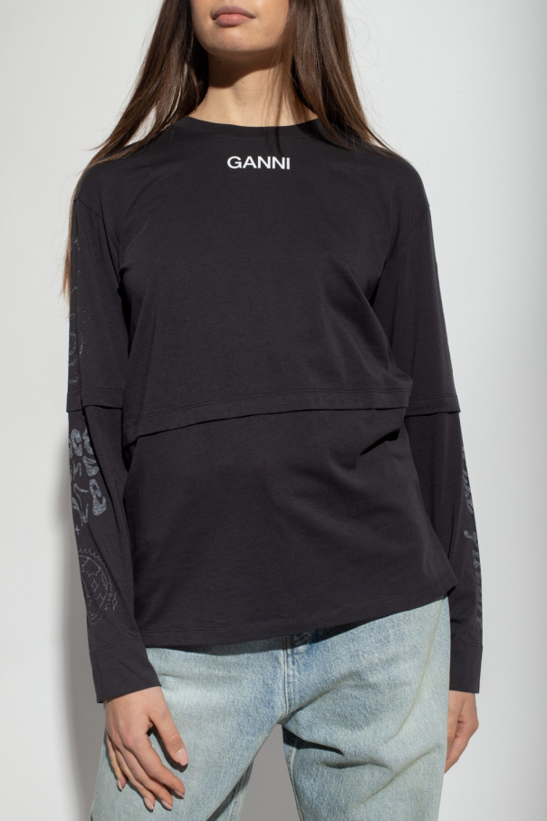 Black top from Ganni. Crafted from organic cotton, this style features long sleeves, an elasticated collar and printed black graphics and white logo.
