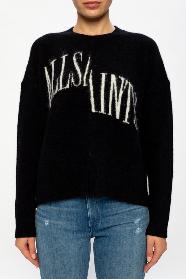 Black 'Split' crewneck sweater from AllSaints. Crafted from wool blend knit, this jumper showcases white logo graphic on the front, slits on the sides and ribbed finishes at the bottom hem and cuffs.