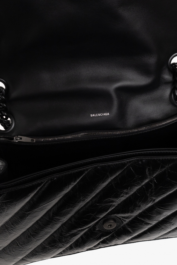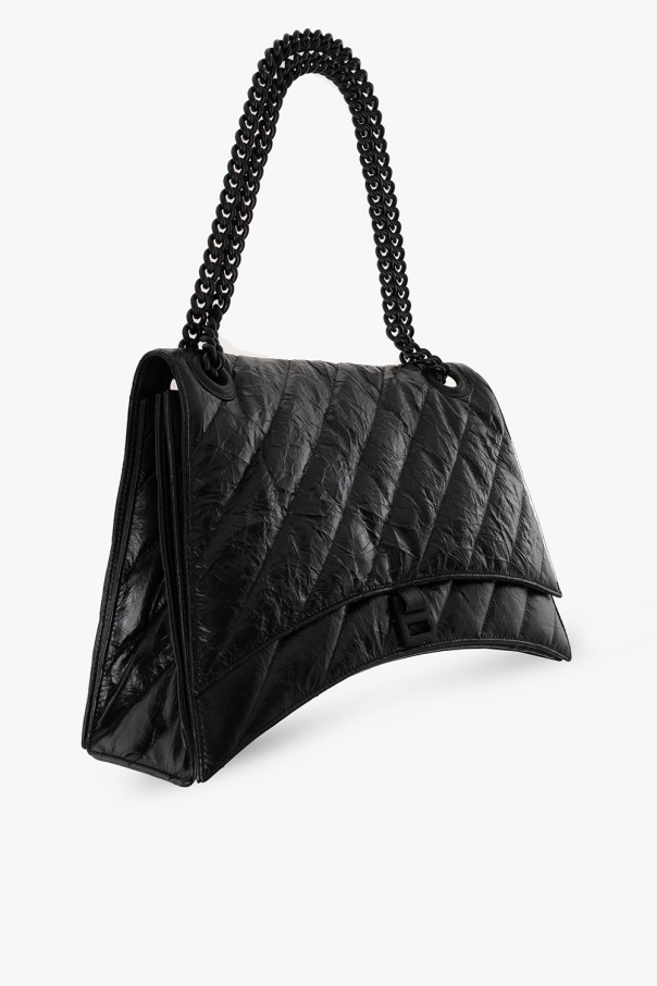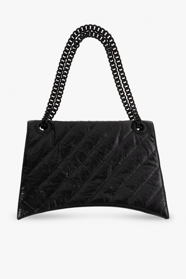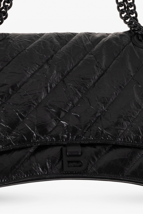 Black ‘Crush Large’ quilted shoulder bag from Balenciaga. Crafted from calf leather with a crinkle and vintage effect, this model fastens with a snap and is decorated with a logo appliqué. It is complete with a double shoulder chain, black metal hardware and three separate internal compartments with one slip pocket and one zip pocket.
