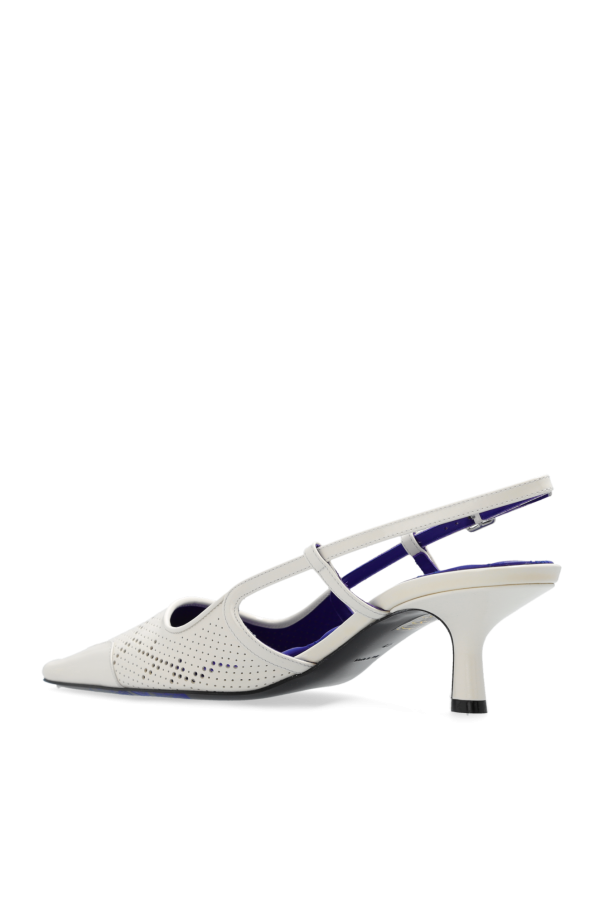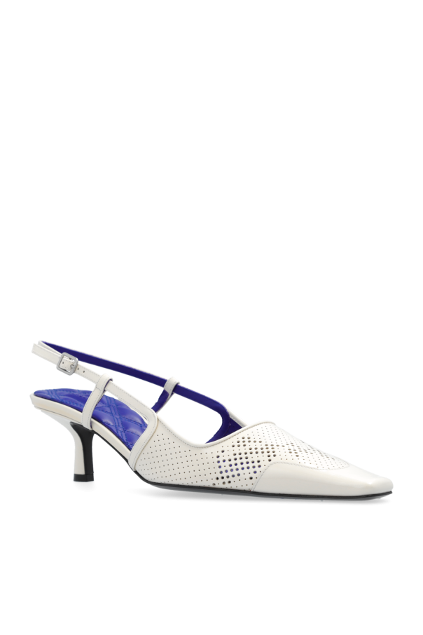 Cream ‘Chisel’ pumps from Burberry. Made from calf leather accentuated with perforated roses, this model sits on a black leather sole embellished with a blue ‘Equestrian Knight’ motif and features an elongated, square toe and a buckle strap.