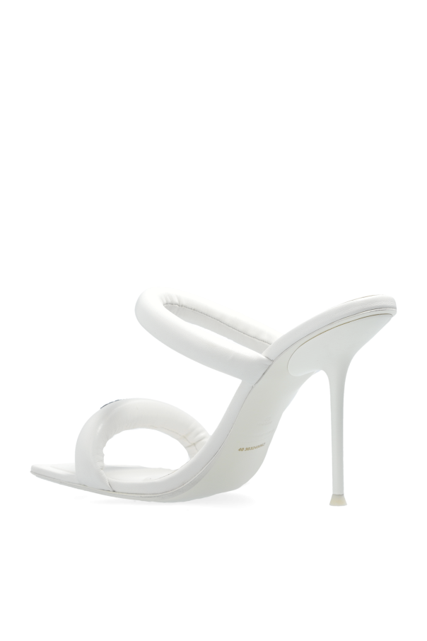 Introducing the exquisite ‘Julie’ Heeled Mules from the illustrious collection of renowned designer Alexander Wang. These mules epitomize elegance and modern sophistication, making them an impeccable choice for any refined occasion. Crafted with meticulous attention to detail, the mules feature a high, slender heel that imparts an air of grace. The design is complemented by two thick, rounded straps that embrace the foot, offering both security and a contemporary aesthetic. Constructed from pristine white leather, these mules exude luxury. The lower strap and the insole are adorned with the distinctive alexanderwang logo, enhancing their exclusivity. Additionally, the squared-off toe adds a fashionable touch, aligning with modern trends. Why Choose the ‘Julie’ Heeled Mules? Elegant Design: High, slender heel and rounded straps for a chic look. Premium Materials: Made from sumptuous white leather. Exclusive Detailing: Features the iconic alexanderwang logo. Fashion-Forward: Stylish square-toe finish.
