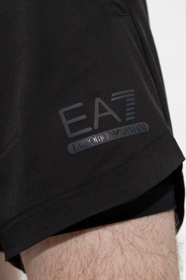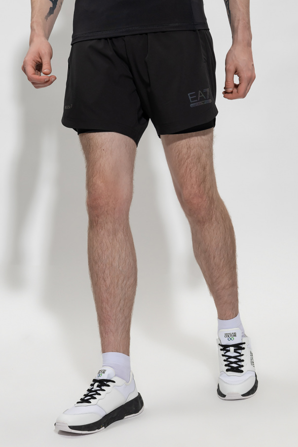 Black training shorts from EA7 Emporio Armani. Crafted from innovative VIGOR7 material that encourages an increase in blood flow and muscle oxygenation while reducing vibrations, this pair offers fast-drying and breathable properties. It also has a drawstring waistband, two slip pockets and reflective logo detailing on the front.