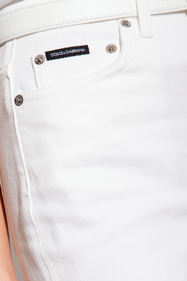 White ‘Audrey’ jeans from Dolce & Gabbana. Falling with narrow legs, this pair features a zip fly with a button, classic five pockets and a metal logo plaque on the back.
