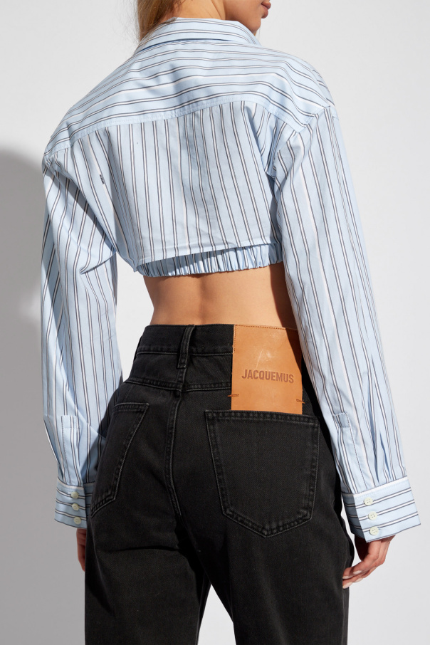 Blue and white ‘Bahia’ shirt with a collar from Jacquemus. Made of cotton with a cropped fit, this style showcases a vertical stripe pattern, button fastenings accompanied by a snap closure, decorative draping at the hem as well as a back opening with a sewn-in elastic insert, long sleeves with button cuffs and an inner tank top.