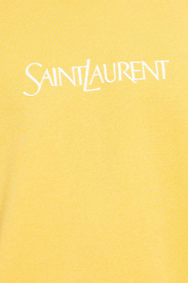 Introducing an exquisite manifestation of contemporary fashion, the Saint Laurent Logo Sweatshirt. Distinguished by its vibrant yellow hue, this piece exudes an aura of sophistication and boldness. Crafted from 100% premium cotton, its texture offers a soft, tactile experience, ensuring not only style but exceptional comfort. The sweatshirt features an iconic, centrally placed \"SAINTLAURENT\" inscription in bold, white letters that immediately captures the eye, proclaiming its designer pedigree with unmistakable clarity. Its unique short sleeves, a rare find in sweatshirts, along with a classic rounded neckline, underscore the garment\'s distinctive minimalist design, devoid of extraneous embellishments. The product is meticulously finished with ribbed hem and cuffs, enhancing its sleek silhouette while ensuring a perfect fit. This piece is a testament to Saint Laurent\'s commitment to luxurious simplicity and innovative design. Why Purchase This Product? Exclusive Saint Laurent design, making a bold fashion statement. Made from high-quality cotton, offering unparalleled comfort and durability. Features a distinctive embroidered logo for an elevated aesthetic appeal. Unique short sleeve design, perfect for versatile styling across seasons. Minimalist yet striking, easily complements a variety of outfits.