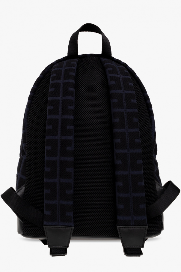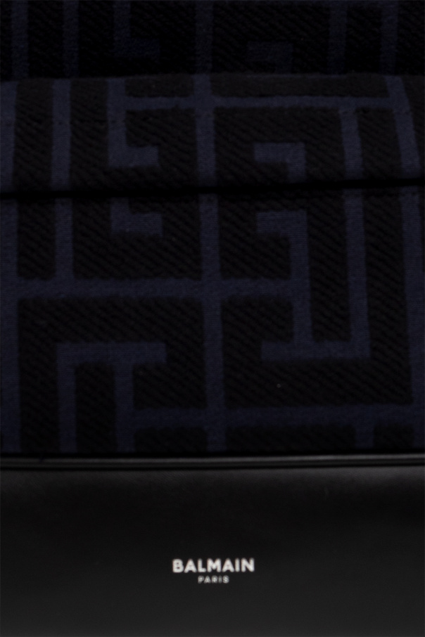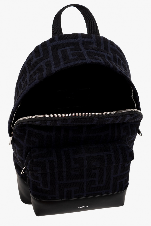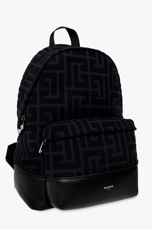 Navy blue and black ‘1945’ backpack from Balmain. Crafted from monogrammed canvas, this design secures with a two-way zipper and features calf leather trims, a zip pocket accompanied by a gold-tone logo print on the front, a half-round handle, adjustable shoulder straps, silver-tone metal hardware and one internal compartment with one slip pocket and one card slot.