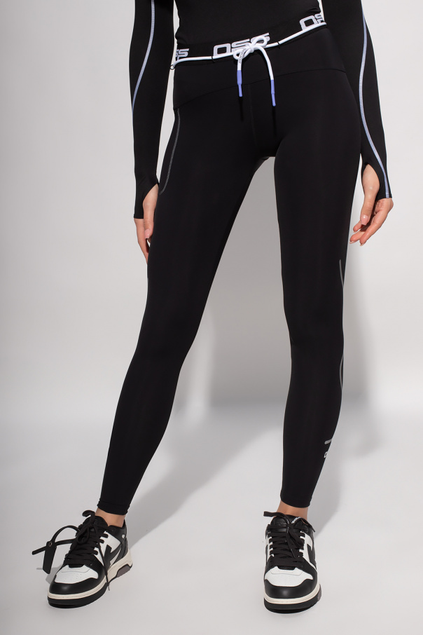 Black leggings from Off-White, the ‘Active’ line. Enriched by reflective inserts and a white logo, they feature an elasticated waistband with a drawstring fastening.