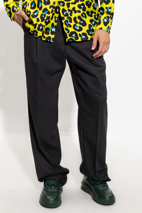 Dark grey pleat-front trousers from Versace. Made of wool, this pair is complete with a button, zip and hook fastening, four slip pockets and straight legs.