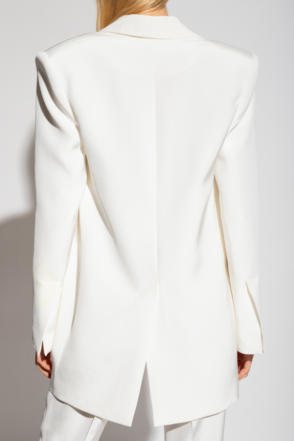 White ‘Caen’ blazer from The Mannei. Crafted from silk, this garment features button fastenings, notch lapels, two flap pockets, padded shoulders, long sleeves and single rear vent.