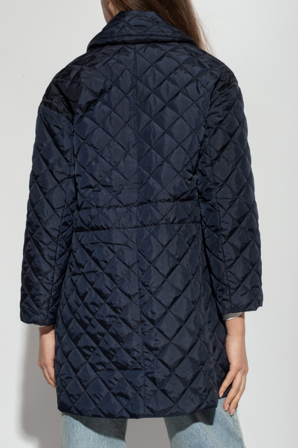Navy quilted coat from Ganni. Fastened with snaps, this long sleeve design features two slip pockets and notch lapels.