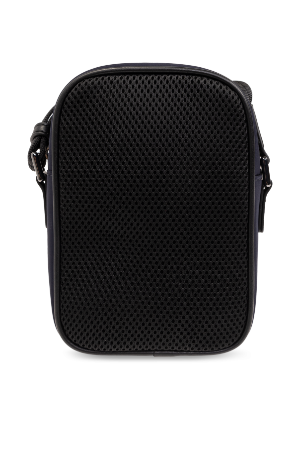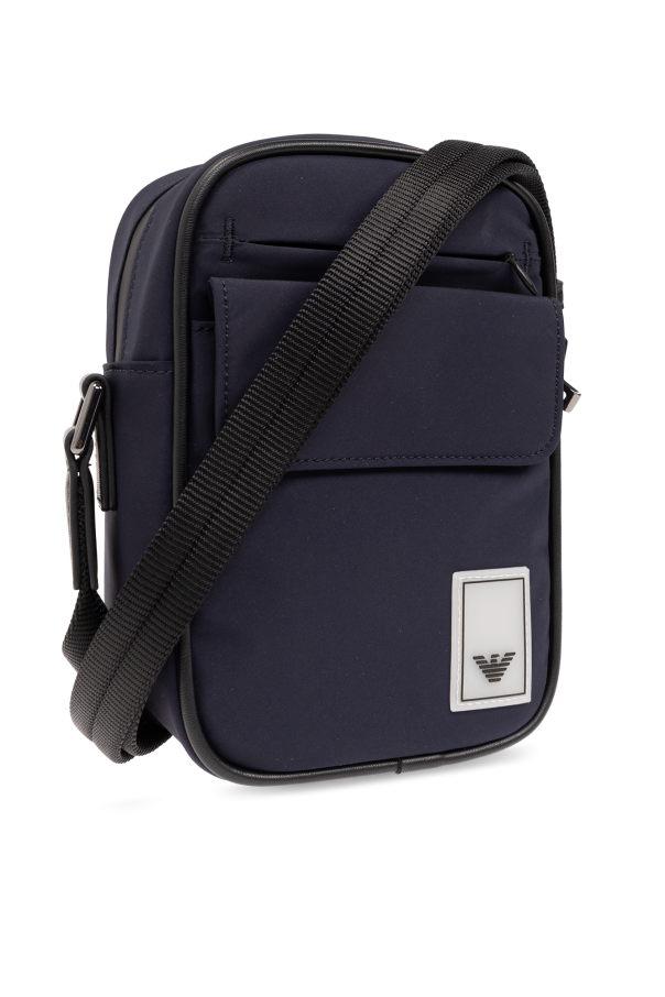 Navy blue shoulder bag from Emporio Armani. Emblazoned with a logo patch, this design fastens via a zip and features an adjustable strap, one pocket with a hidden zip and one flapped pocket with a magnetic snap on the front, silver-tone metal hardware and one internal compartment with three card slots.