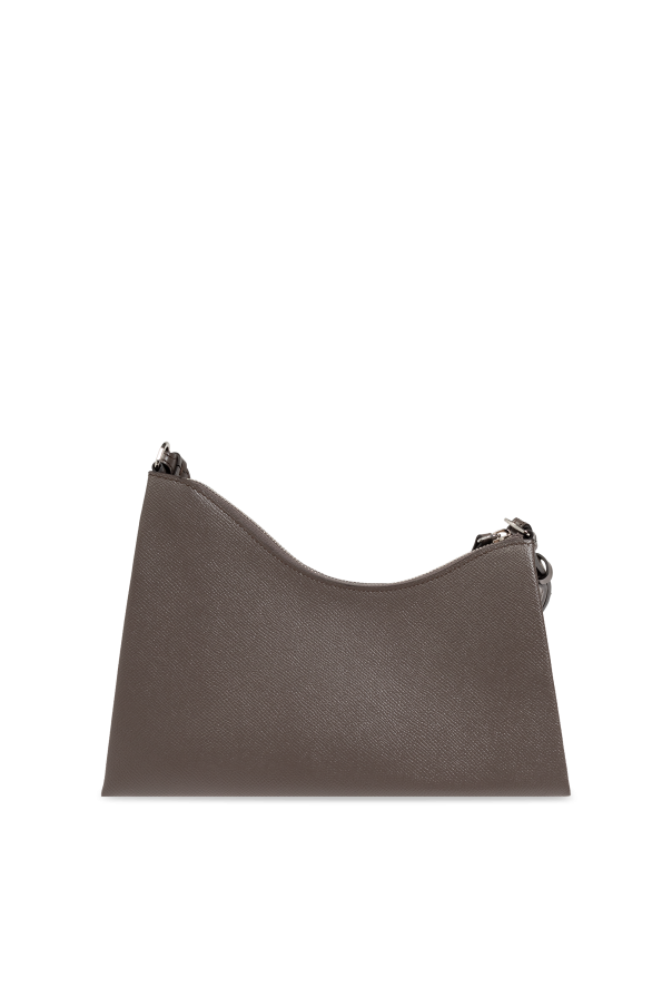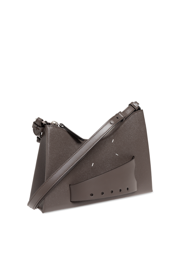 Introducing the Maison Margiela Shoulder Bag, a paragon of sophistication from the esteemed fashion house. This exclusive piece embodies modern elegance with its asymmetrical shape and minimalist design, making it a standout addition to any ensemble. Crafted from the finest textured brown leather, this bag exudes a refined aesthetic. The interior is lined with a dark, velvety material, providing a luxurious touch to every interaction. The main body, with its distinctive triangular form and gently rounded edges, showcases Maison Margiela\'s commitment to unparalleled artistry. On the front, a unique panel of deeper-hued leather features a series of cut-outs and perforations, accentuated by white stitching, which may signify the designer\'s emblem or serve as a decorative element. The bag\'s adjustable shoulder strap, also made from premium brown leather, ensures a perfect fit with its sleek buckle mechanism. Functionality meets style with a secure zippered main compartment and an internal slip pocket, offering ample space for essentials. This unisex accessory seamlessly transitions from casual outings to formal events, underscoring its versatile appeal. Why Choose This Product? Crafted from high-quality textured leather for an elegant look. Unique asymmetrical design with a trifold form. Adjustable strap for personalized comfort. Secure zippered closure for added safety. Unisex design, perfect for any occasion. Distinctive detailing with cut-outs and white stitching.