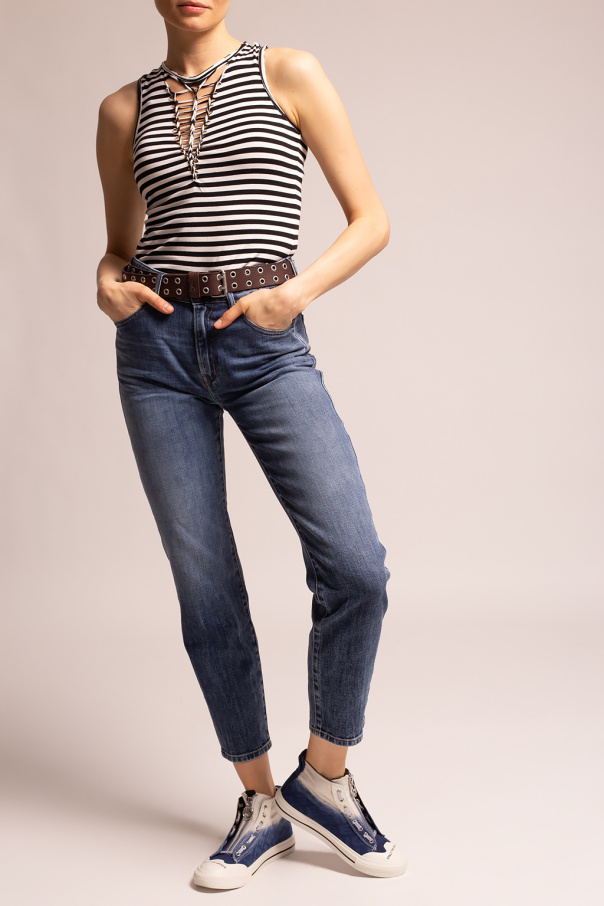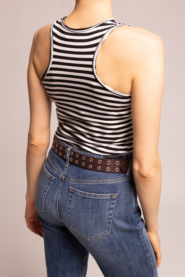 Black and white crewneck sleeveless top from Diesel. Crafted from cotton with all-over stripes, this style showcases a plunging V-neckline with braided cut-outs.