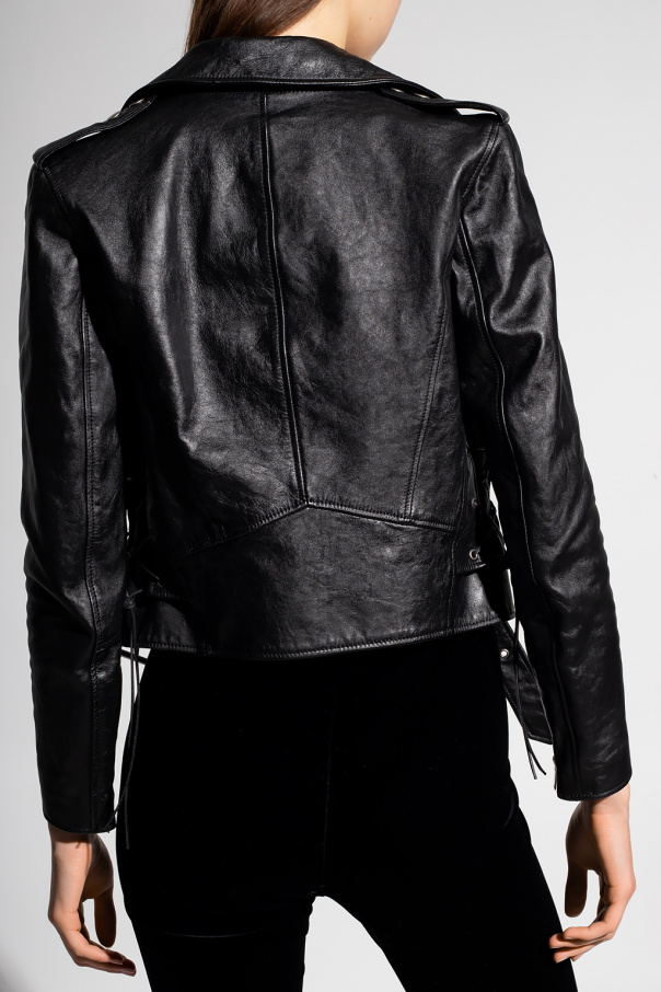 Black jacket from Saint Laurent. Crafted from calf leather and punctuated with studs, this style features a zip fastening, a buckle belt at the hem, notch lapels, one zipped pocket, decorative tie details on the sides and long sleeves with zipped cuffs.