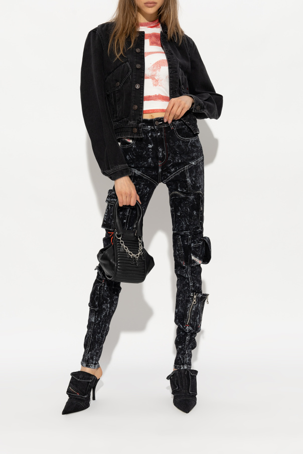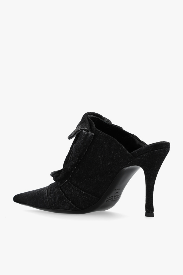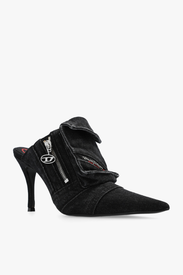 Black ‘D-VENUS POCKET’ heeled mules from Diesel. Made of fabric and leather, this pair features a side zip, sun-faded wash effect, pointed toe and black leather sole.