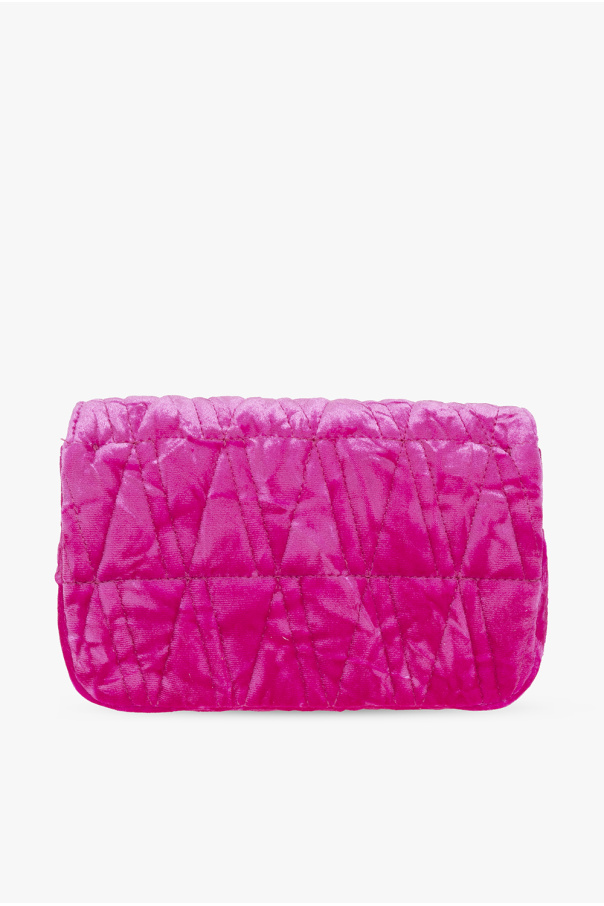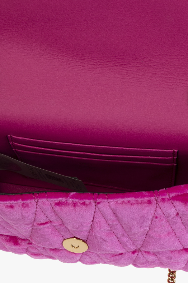 Pink ‘Virtus Mini’ shoulder bag from Versace. Crafted from velvet, this model fastens with a snap button and is enriched by decorative V-pattern quilting and flap with a metal Barocco V appliqué engraved with acanthus leaf detailing. It is complete with a detachable shoulder chain, gold-tone metal hardware and one internal compartment with three card slots.