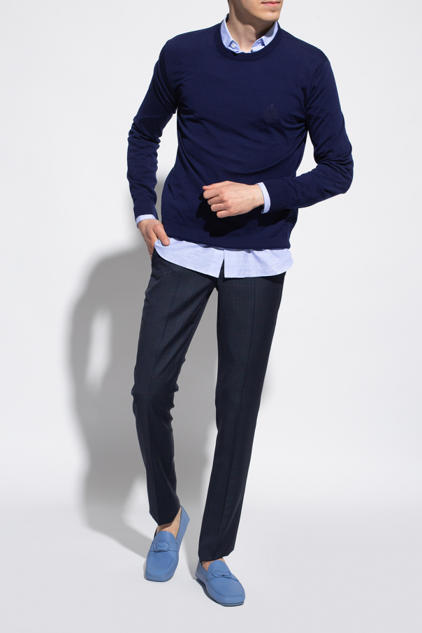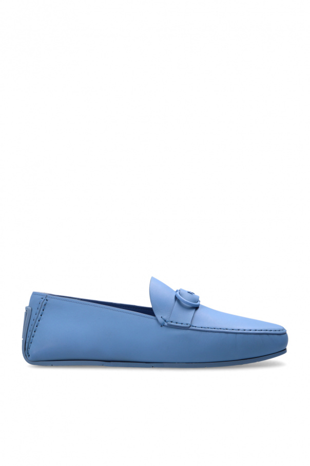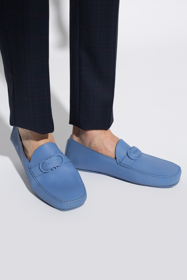 Blue ‘Palinuro’ moccasins from Salvatore Ferragamo. Crafted from calf leather, this square toe design features a logo-embossed strap and a blue rubber sole.