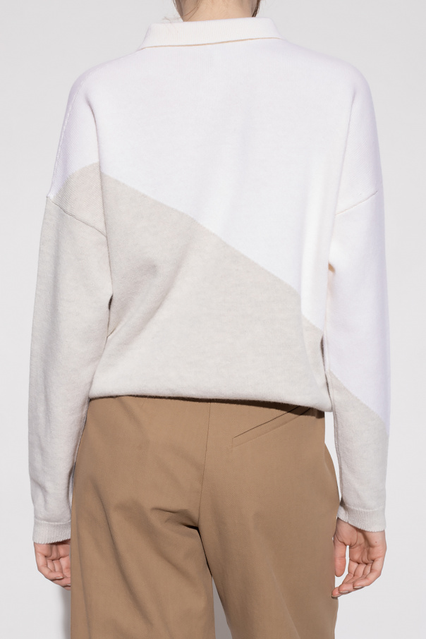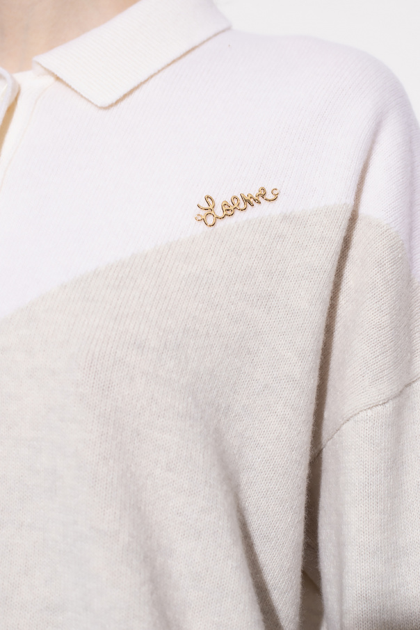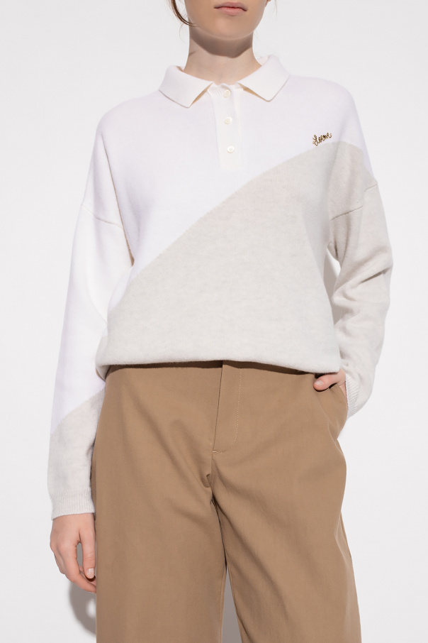 Cream and grey sweater from Loewe. Made of wool, this garment features a buttoned collar, gold-tone logo appliqué and ribbed trims at the hem and cuffs.