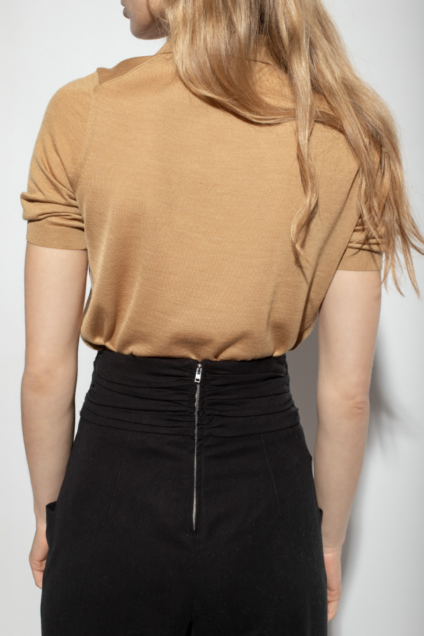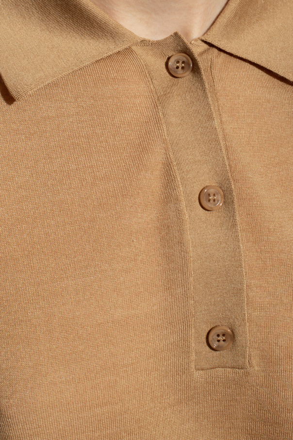 Light brown ‘Madeline’ polo shirt from Burberry. Crafted from a wool, silk and cashmere blend, this style showcases brown monogram embroidery, a button placket, short sleeves and rib trims on the bottom hem and cuffs.