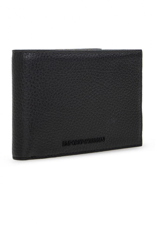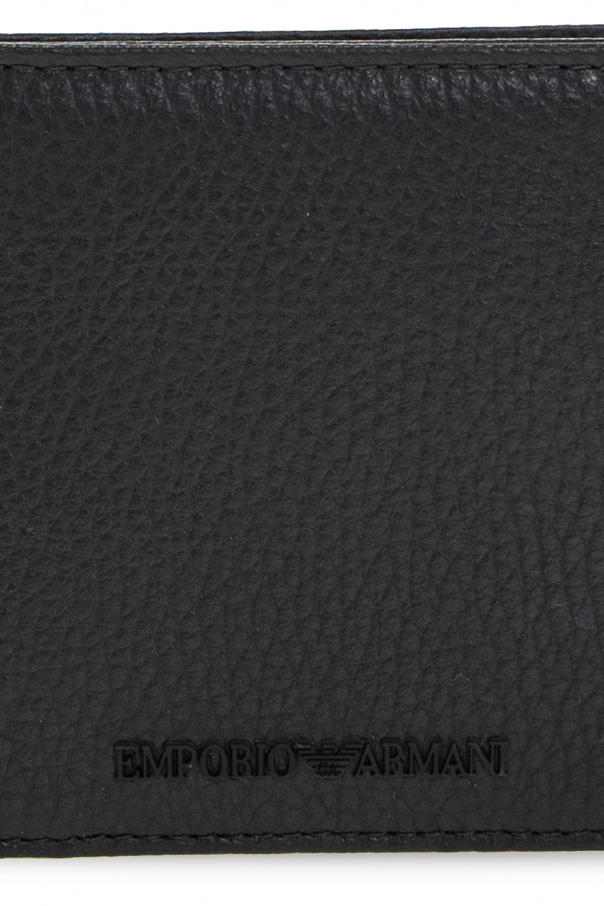 Black folding wallet from Emporio Armani. Crafted from ovine leather, this item showcases a tactile logo as well as two bill compartments, six slip pockets and eight card slots inside.